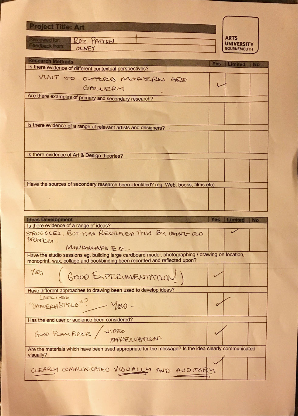 Evaluative notes taken on form during my presentation (completed by Phillip)